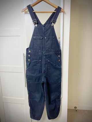 Mono vaquero de Zara. - Tiene correas en los tobillos para ajustar el bajo y darles efecto balloon - Tirantes ajustables. - Bolsillos oversize estilo carpenter en la parte delantera y trasera. - Cierre lateral con botones.