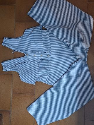 Mono de Zara con un diseño de rayas verticales en tonos azules y blancos. Es una prenda cómoda y versátil. Cierre con botones en la parte delantera. Tejido ligero y transpirable.