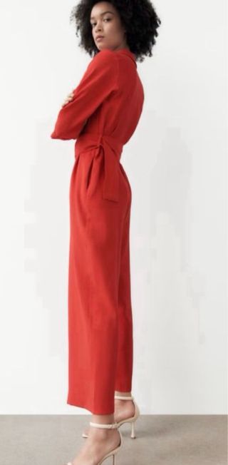Elegante mono rojo de Zara. - Diseño con mangas acampanadas. - Cintura marcada. - Piernas largas y rectas.