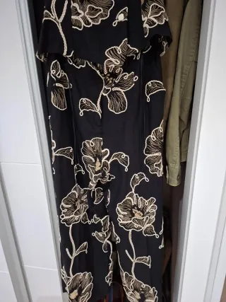 Mono de Zara con un bonito estampado floral. - Diseño con escote cuadrado. - Detalle de botones en la parte delantera. - Cintura con peplum. - Estampado de flores en tonos dorados sobre fondo negro.