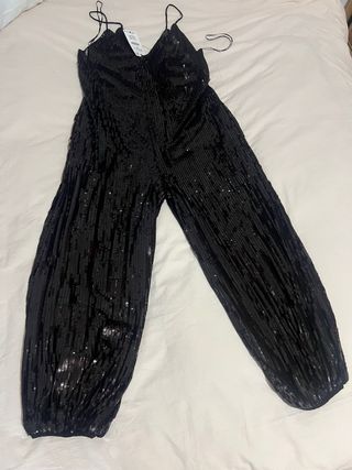 Mono largo con lentejuelas brillantes. - Diseño con tirantes finos. - Piernas anchas y fluidas.