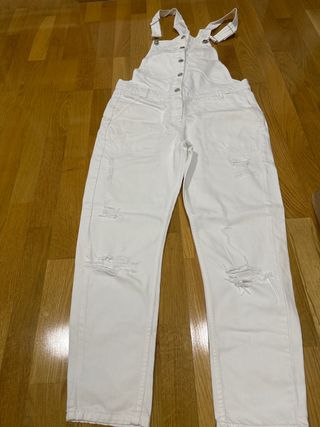 Mono largo de tela vaquera en color blanco. Presenta un diseño desgastado con rotos en las rodillas y bolsillos. - Tirantes ajustables. - Cierre de botones en la parte delantera. - Bolsillos delanteros y traseros.