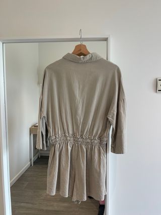 Mono corto de Zara en color beige, talla S. - Diseño con cuello camisero. - Cintura elástica con cordón. - Bolsillos delanteros. - Manga tres cuartos.