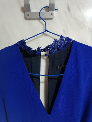 Mono en color azul eléctrico.Talla M.De pata ancha con lazo en la cintura.Detalle de la puntilla en el cuello.Espalda abierta atada con un botón.Un solo uso