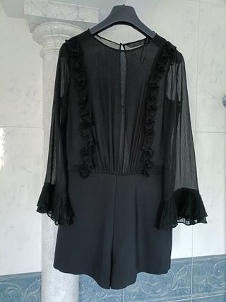 Mono corto de color negro de Zara. Parte superior de gasa. Delantero doble tejido. Detalle puños plisados. Espalda abierta con dos botones. Cremallera en parte inferior. Talla M. Largo 82 Etiqueta cuidado cortada Muy buen estado