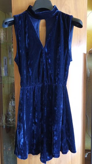 Mono cortito talla S. De terciopelo azul oscuro con abertura en escote y espalda. Muy bonito,es arregladito. Cómo nuevo, sólo un par de puestas. Más bonito que en fotos, al ser terciopelo las fotos no sé aprecian bien. Zara
