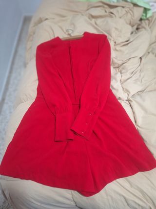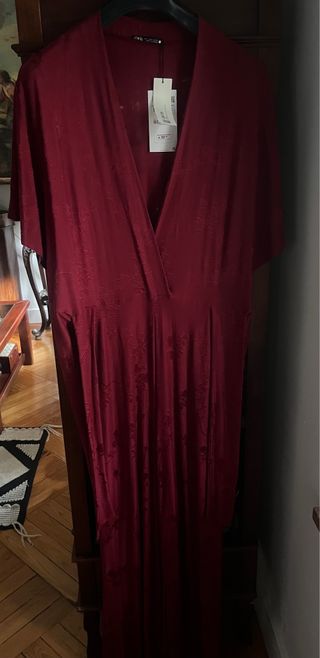 Precioso mono rojo de Zara, talla S. Es un diseño cruzado, favorecedor y elegante. - Escote en pico. - Manga corta. - Tejido fluido. - Cierre con botón en la espalda. - Detalle de lazo en los bajos.