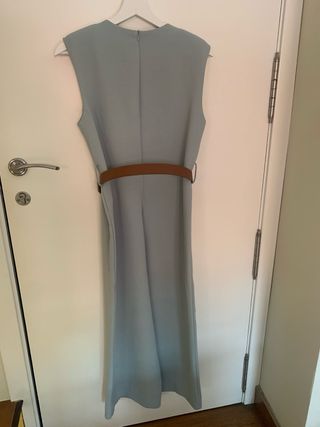 Precioso mono de Zara en azul claro. Es de un tejido suave y ligero, ideal para primavera/verano. Tiene un diseño sencillo y elegante, perfecto para cualquier ocasión. - Cierre de cremallera invisible en la espalda. - Escote en pico. - Sin mangas. - Cinturón incluido.