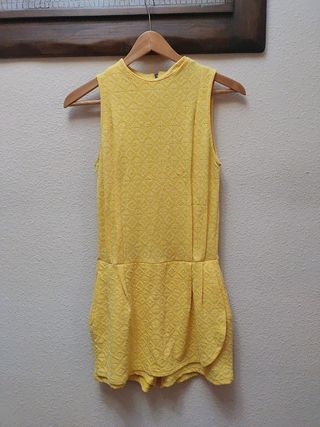 Precioso mono corto de Zara en color amarillo, talla S. Es de un tejido suave y tiene un diseño bonito. - Cierre de cuello alto. - Sin mangas. - Bolsillos funcionales.