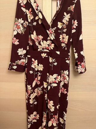 Precioso mono de Zara Basic, con un estampado floral precioso en tonos marrones y multicolor. Es una prenda elegante y versátil, ideal para cualquier ocasión. - Diseño de cuello cruzado. - Manga tres cuartos. - Pantalón de corte recto. - Cierre con cremallera invisible en la espalda.
