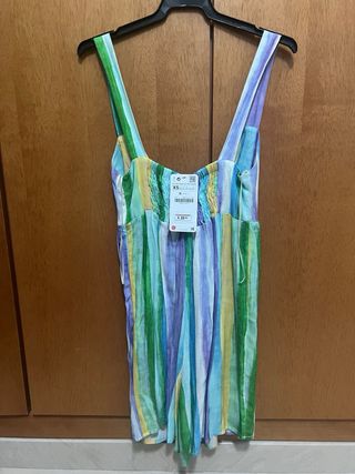 precioso mono multicolor de zara,es bastante corto y con vuelo. lleva un nuevo en el pecho para ajustartelo como tu quieras.