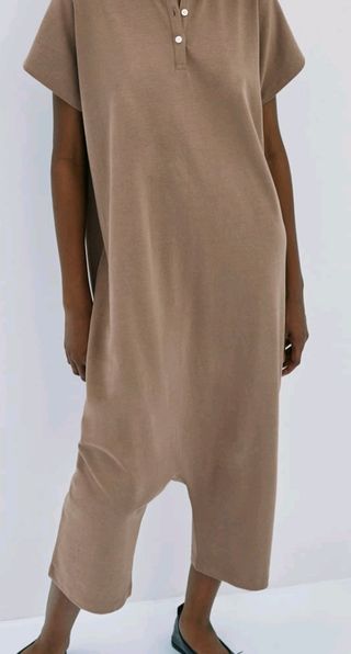 Precioso mono de piel marrón de Zara. Está en muy buen estado y es una prenda muy estilosa. - Diseño de peto. - Bolsillos funcionales. - Corte amplio y cómodo.