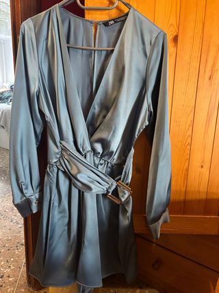 Precioso vestido corto de Zara en color azul grisáceo. Es de raso, con manga larga y una hebilla plateada en la cintura. Tiene un corte favorecedor. - Cierre con botones en la espalda - Tejido fluido y suave - Ideal para ocasiones especiales