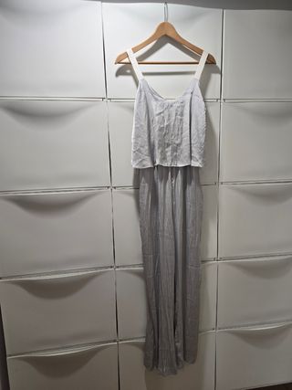 Precioso mono largo de Zara en color gris plata. Es una prenda elegante y versátil, ideal para cualquier ocasión. - Diseño de tirantes color blanco. - Tejido muy fluido y fresquito. - Corte recto.