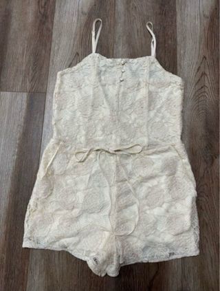 Precioso mono corto de encaje de Zara en color beige. Ideal para eventos especiales o para un look de verano elegante. - Es de encaje delicado. - Tiene un diseño bonito y femenino. - Se abrocha con botones en la parte delantera. - Incluye una cinta para anudar en la cintura.