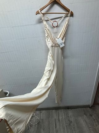 Precioso mono largo de Zara en color amarillo. ✨ Es de satén y tiene un diseño elegante y favorecedor. - Cierre con lazo en la cintura. - Sin mangas. - Largo por debajo de la rodilla. - Tejido fluido y suave.