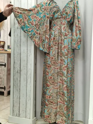 Vestido largo con un bonito estampado floral y de cachemir. Tiene mangas acampanadas y un escote en V. - Estampado paisley en tonos rosas y turquesas. - Mangas amplias tipo campana. - Cintura elástica para un ajuste cómodo. - Largo hasta los tobillos.