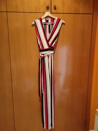 Mono largo de lino con un diseño de rayas verticales. Presenta un nudo decorativo en la parte delantera. Perfecto para verano - Tejido de lino. - Estampado de rayas. - Nudo frontal.