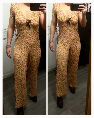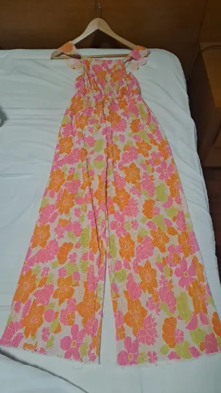 Mono de verano con estampado floral vibrante. Ideal para días soleados. - Diseño con volantes en los hombros. - Piernas anchas y fluidas. - Tejido ligero y con textura.