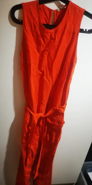 Mono largo de color rojo, ideal para cualquier ocasión. Presenta un diseño elegante y cómodo. - Cinturón a juego. - Sin mangas. - Cuello redondo.
