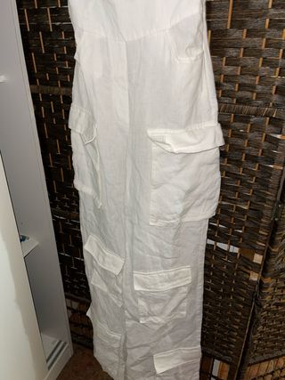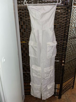 Mono largo de tela ligera, perfecto para un look veraniego. - Diseño sin tirantes. - Múltiples bolsillos cargo. - Piernas anchas.