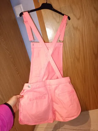 Mono corto de color rosa, perfecto para el verano. - Tirantes cruzados en la espalda. - Bolsillos traseros.