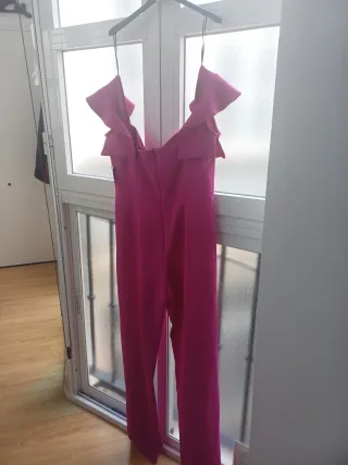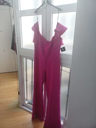 Mono largo de color rosa con volantes en los hombros. - Diseño de hombros descubiertos. - Piernas anchas. - Cierre de cremallera oculta.