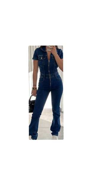 Mono vaquero de manga corta con cierre de cremallera frontal. Diseño ajustado con efecto acampanado en las piernas. - Bolsillos delanteros. - Cuello camisero. - Cintura marcada.