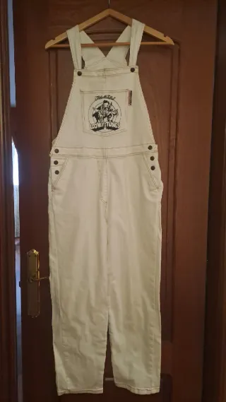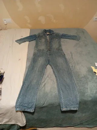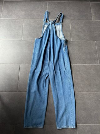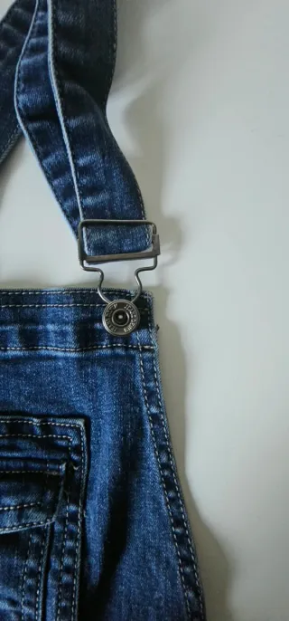 Mono vaquero largo con un diseño moderno y desgastado. - Bolsillos delanteros y traseros. - Tirantes ajustables con botones. - botones laterales. -un tirante de la parte del botón esta roto pero funciona bien.
