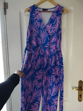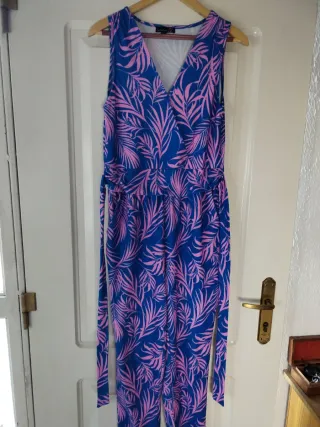 Mono con un llamativo estampado de hojas en tonos azul y rosa. Presenta un diseño cruzado en la parte superior y un cinturón para ajustar. - Diseño sin mangas. - Cinturón a juego. - Estampado tropical.