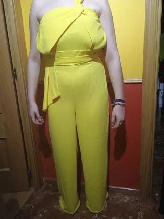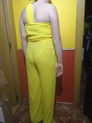 Elegante mono largo de fiesta en color amarillo. - Diseño de un solo hombro. - Cinturón a juego. - Piernas anchas.