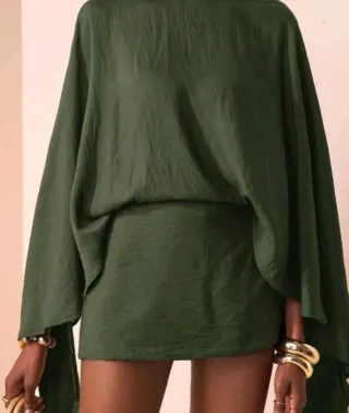 Mono de color verde con mangas amplias y falda corta. - Diseño holgado en la parte superior. - Tejido con textura.