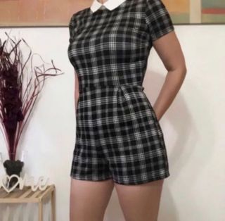 Mono Jennyfer, estampado de cuadros negro y blanco, detalle de cuello blanco, manga corta y cremallera en la parte posterior. Tejido elastico. Talla S. Composicion 98% Poliester 2% Elastan. Nuevo sin etiqueta Medidas Sisa 42 cm Cintura 34 cm Largo 73 cm