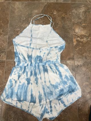 Mono corto con un diseño tie-dye en tonos azules y blancos. Ideal para un look casual y veraniego. - Tirantes finos cruzados en la espalda. - Cintura elástica. - Detalle de pedrería en la parte delantera y en la pierna.
