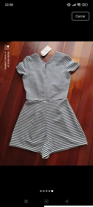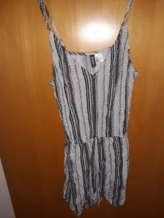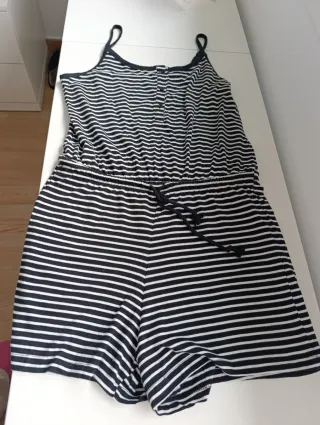 Mono corto de tirantes con estampado de rayas y puntos. - Diseño con cintura elástica. - Tirantes finos ajustables. Tiene bolsillos. En perfecto estado como nuevo se puede ver sin compromiso.