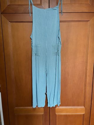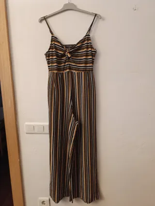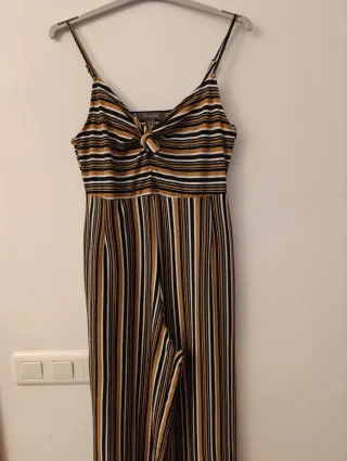 Precioso mono de rayas. Lleva un cinturón que se puede quitar o poner. Se abrocha a la espalda con cremallera. Talla M.