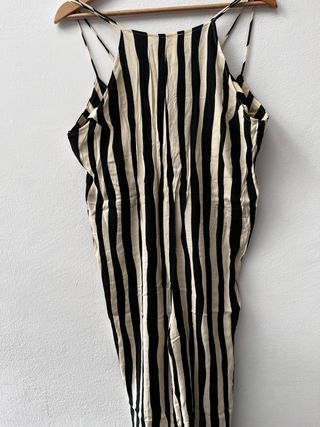 Mono midi de Mulaya con un diseño de rayas verticales en blanco y negro. Es una prenda sin estrenar, ideal para añadir un toque elegante a tu armario. - Diseño de rayas verticales. - Largo midi. - Tirantes finos.