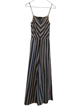 Mono de rayas verticales con un diseño moderno y favorecedor. Nunca se ha usado - Diseño de tirantes finos. - Abertura en la zona del pecho. - Piernas anchas y fluidas.