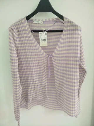 1 Chaqueta de punto fina con un diseño de rayas verticales en tonos morado y blanco. Es abierta por delante y tiene un cordón para atar. 1 Mono largo y un mono corto negro. -Prendas de verano. - Todas las prendas a estrenar. -Talla mediana. -Las 3 prendas 10€