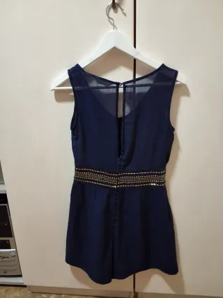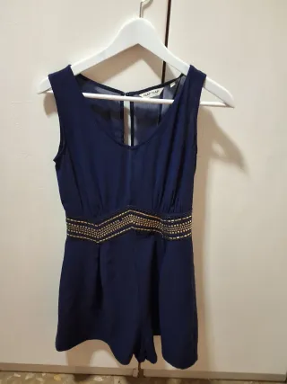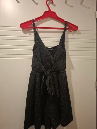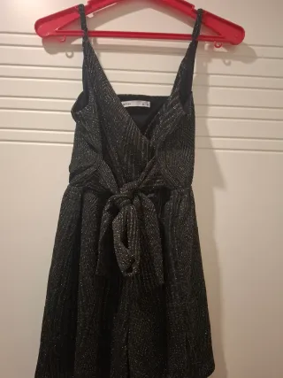 Mono corto con tejido brillante. Talla M. Puesto un vez. - Diseño con escote en V. - Tirantes finos. - Detalle de lazada en la cintura.
