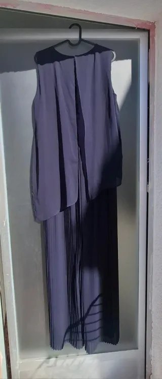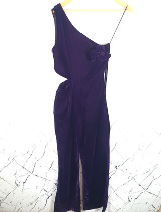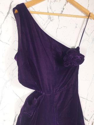 Precio tienda 60€ - 👗 Mono largo cocktail de tirantes morado de terciopelo con adorno de flor, colección fiestas y ceremonias de Mango. Nuevo a estrenar, con etiqueta. Talla XS (34): 154 cm largo, 38 cm axilas, 32 cm cintura, 30 cm bajo. Diseño recto y asimétrico con abertura en cintura. Sin mangas, un solo tirante. La flor viene aparte con imperdible y cordones; se puede colocar sobre el mono o en el cuello tipo gargantilla. Cremallera invisible lateral, fácil de abrochar. Talle alto, se ajusta a la forma del cuerpo, resaltando la figura. velvet purple asymmetrical jumpsuit flower