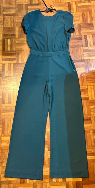 Mono de fiesta de confección con manga corta y pantalón largo. - Diseño elegante con espalda abierta y volante por detrás. - Combinación de colores negro y turquesa. - Talla S. - Solo tiene una puesta.