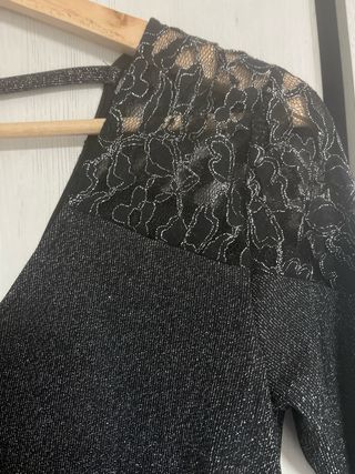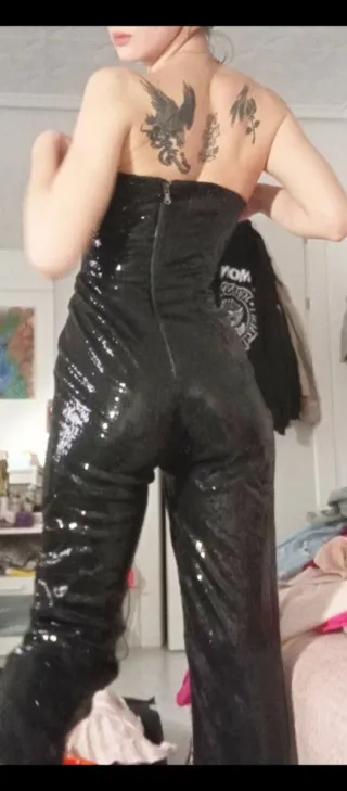 Elegante mono de fiesta con top de lentejuelas plateadas y negras. La parte inferior es de pantalón largo negro y viene con un cinturón a juego. - Diseño con escote pronunciado. - Manga corta. - Cinturón negro con hebilla dorada. - prenda versátil para cualquier fondo de armario para eventos. - Elegante al máximo es una talla S pero da desde una 34 a una 40 tranquilamente. En los hombros, lleva un poquito de almohadilla que ayuda a que quede perfecto y no quede caído . Precio no negociable