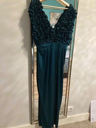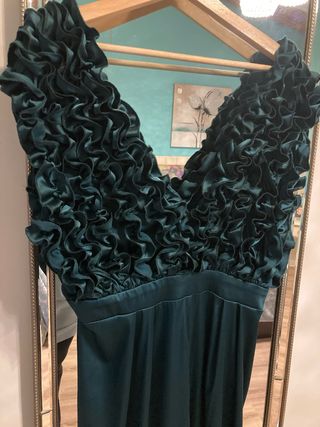 Elegante mono largo de fiesta en color verde. Presenta un diseño con escote pronunciado y detalle de volantes. - Talla L (equivalente a 40/42). - Escote en V con volantes. - Piernas largas y fluidas.