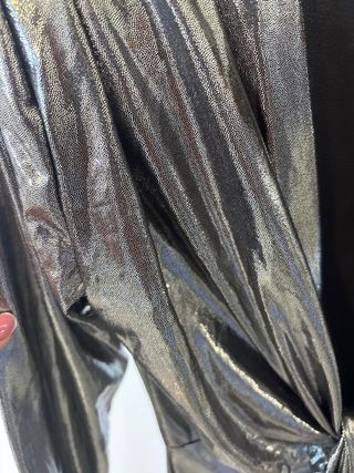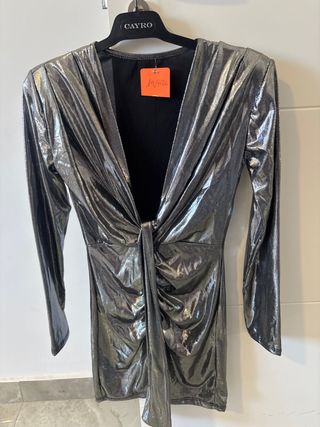 Mono de fiesta con un llamativo acabado brillante. Perfecto para eventos especiales. - Diseño con escote pronunciado. - Detalle de nudo y drapeado en la cintura. - Mangas largas.