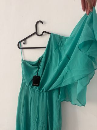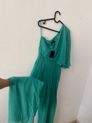 Elegante mono de fiesta con un diseño asimétrico y caída fluida. Perfecto para eventos especiales. - Color verde - Diseño de una manga - Tejido ligero y vaporoso