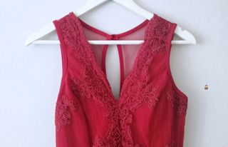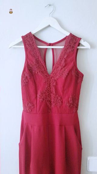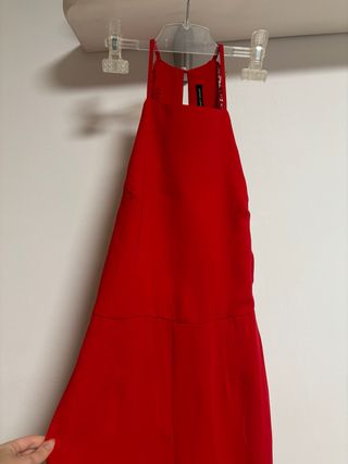 Mono pantalón largo en color rojo dispone de cremallera trasera y dos bolsillos. • Cintura ligeramente elástica. • Posibilidad de llevar sin sujetador. • Material: viscosa, poliéster y elastano. • Usado una sola vez, en una boda. Talla S. • Medidas aproximadas: sisa a sisa 46 cm, cintura 36 cm, largo 140 cm. * Comprado en tienda local especializada en vestidos para eventos, fiestas y bodas.