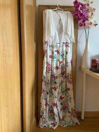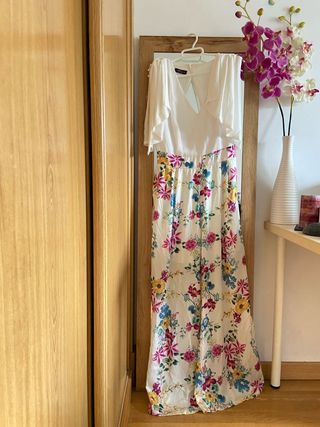 Elegante mono vaporoso con un estampado floral vibrante y un diseño asimétrico. - Tejido ligero y fluido. - Escote en V. - Mangas amplias. - Pantalón de corte recto. Mono largo de fiesta con capa vaporosa de gasa y pierna recta amplia , talla 56/58, precioso y elegante , mono elástico muy cómodo y capa amplia muy elegante , medidas : De sisa a sisa 70 cm Contorno de cintura 124 cm Contorno ce cadera amplia 160 cm Largo 175 cm Medidas tomadas con el tejido relajado ,es amplio , cómodo y elegante