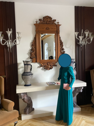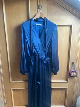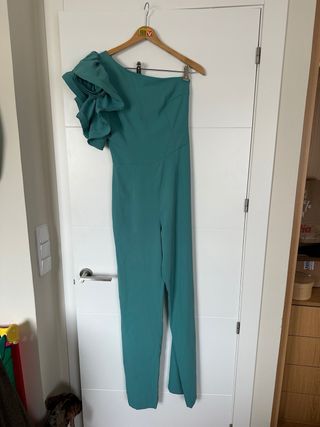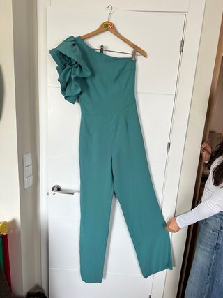 Es un mono largo de corte elegante, con pantalón amplio y caída fluida. Tiene manga larga y un diseño asimétrico muy favorecedor en la parte superior, con un drapeado lateral que le da un aire sofisticado y especial. El tejido parece estructurado pero con movimiento, lo que estiliza mucho la silueta. Color El color es un verde esmeralda intense que funciona muy bien tanto de día como de noche. Solo m e lo h epuesto 1 vez