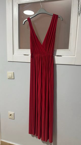 Elegante mono largo de color rojo, ideal para eventos especiales como bodas o graduaciones. - Diseño con escote en V cruzado. - Cintura marcada con detalle de lazada. - Pantalón ancho con plisado. - Tejido ligero y fluido.